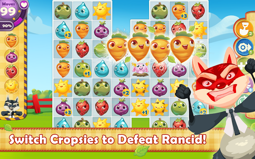 Switch and match the collectable cropsies in this fantastic adventure. Join forces with the Farm Heroes to stop Rancid the Raccoon from spoiling the precious farm lands. Switch and match three or more adorable cropsies to drive Rancid away for good! A farmtastic adventure filled with mixed fruit madness! Scrummy!